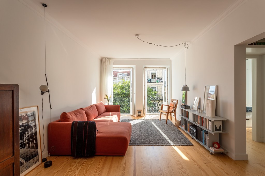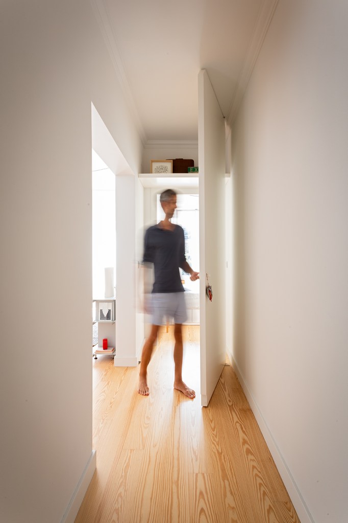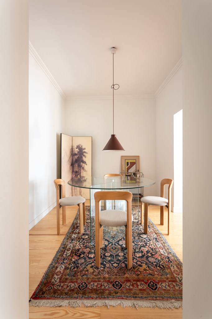A 100m² TF apartment in Lisbon. The client’s goal was to reconfigure the interior bedroom, transforming it into a dining room directly connected to the living space. The common areas were designed to offer a seamless flow from the kitchen to the dining room and living room, through an internal corridor. In the suite, a wardrobe was integrated, functioning as a closet while also creating a cozy nook ideal for relaxing or reading a book. The kitchen was designed with two parallel volumes, optimizing the space with ample storage and large countertops for meal preparation. The project was developed to meet the request with minimal interventions, ensuring the preservation of the existing building’s character.
