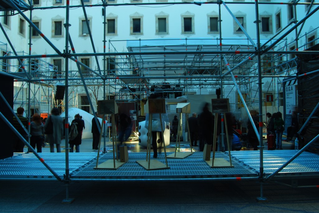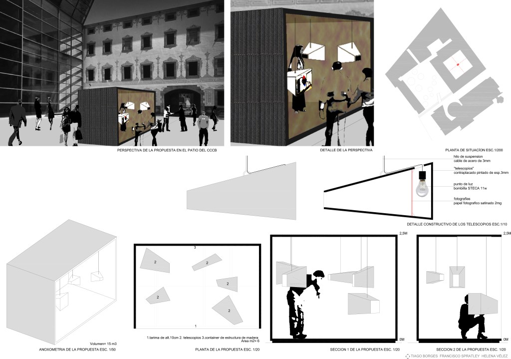 An ephemeral installation during the Architecture Festival eme3 (Collapse 2009) held in the Centre de Culture Contemporània in Barcelona. A conceptual project that denounces a beginning, suggests an end, and captures a moment. A photographic installation that focused on (in)visible details present in the everyday life, from a personal to an urban scale, all witnesses of the passage of time. To exhibit the set of photographs there were created 4 wooden telescopes for the visitor to look through and find these images printed in acrylic base. Depending on the natural day light the experience for each becomes individual and unique.