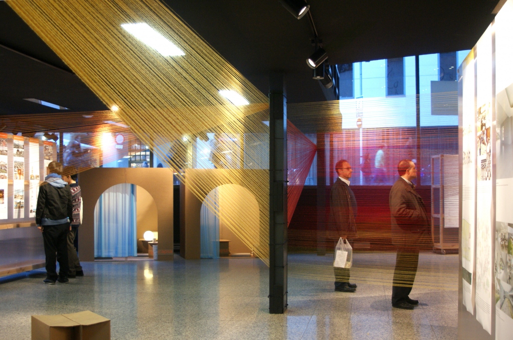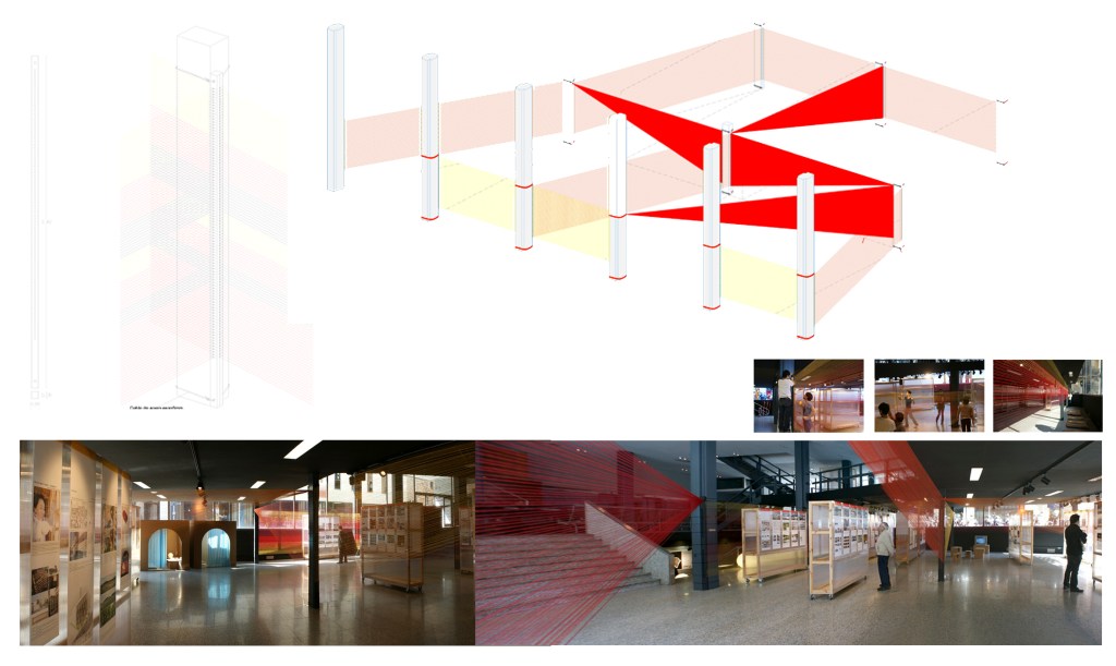 The exhibition “Reset # 11.03.11. New paradigms” brought together 35 Japanese architects from different generations, from students to famous architects (Arata Isozaki, Toyo Ito and Kengo Kuma) to present 54 projects created and executed for the reconstruction of the Tohoku region (Japan) during the first year after the Tsunami in 2011. The concept of scenography was to be recyclable, since it was a month-long event. The idea was to use wool yarns that could be easily reused. The design concept was to create different spaces, taking advantage of the structural pillars of the showroom, creating different environments of color and light and shade. In the end, the wool threads were recycled and generated other products, in honor of the victims of the Tsunami. This project was finalist in the awards, “Premis FAD” 2013 in the ephemeral architecture category.